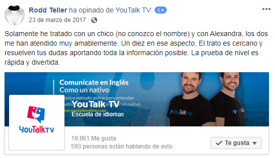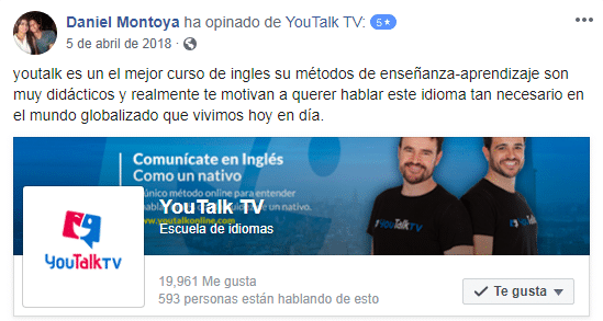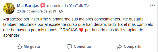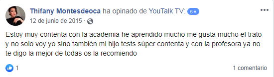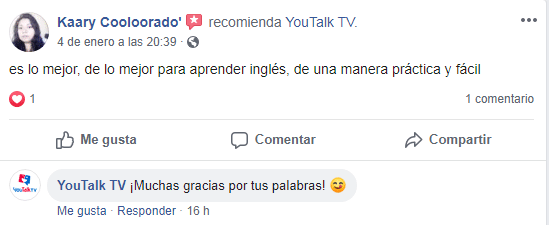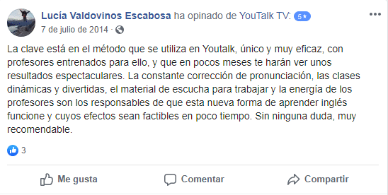 «La metodología de YouTalk es práctica, precisa y entretenida, es el balance ideal para un aprendizaje totalitario, desde la primera lección se hace notoria la evolución en el idioma, y sus maestros son muy dedicados, atentos y, siempre saben cómo brindar una excelente explicación».