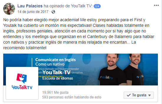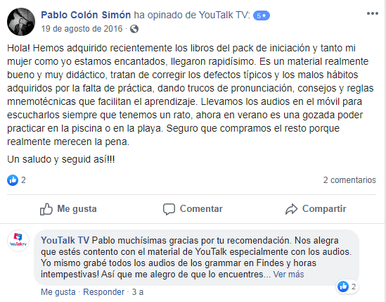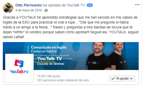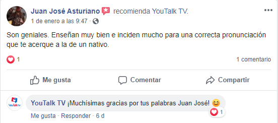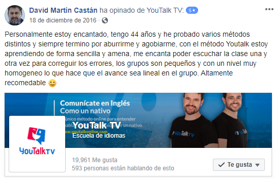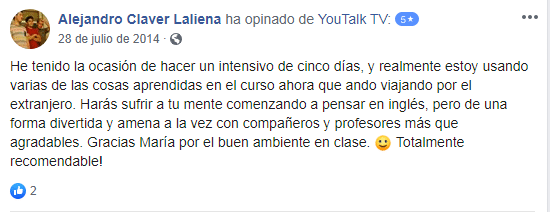 «Estoy contentísimo. Hoy he entendido a la perfección a una clienta inglesa. Trabajo en un gimnasio y le he podido dar la información en inglés. Gracias! (Translated by Google) I am very happy. Today I understood perfectly an English client. I work in a gym and I have been able to give you the information in English. Thank you!»